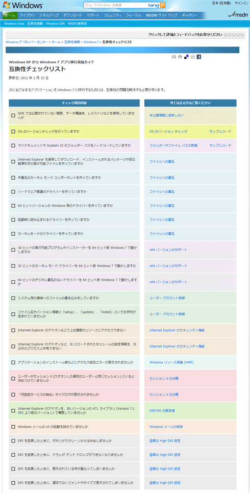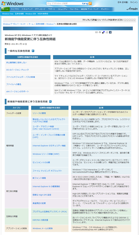 互換性チェックリストをすべて確認し終わり、すべての問題が修正できたら、次に、互換性問題のページを開く。このページの内容を参考に、Windows 7の新機能や機能変更に(互換性の)影響を受けていないかを調べる。