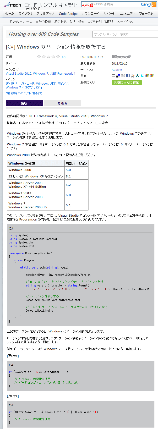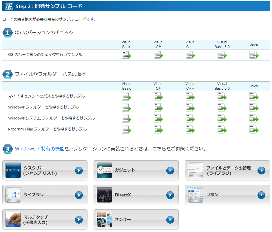 ここでもしWindows 7以降が処理されないようなコードになっている場合は、[当てはまる方はご覧ください]の[サンプルコード]リンクをクリックする。これにより、「移行ステップ2:開発サンプル・コード」の「OSのバージョン・チェック」(詳細後述)が表示される。
