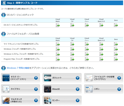前述したように、互換性チェックリストにある[サンプルコード]リンクをクリックすると、「OSのバージョン・チェック」や「ファイルやフォルダのパスの取得」にあるサンプル・コードのリンク集部分に到着する。実際にコードの修正が必要な場合は、各言語のアイコンをクリックして説明ページを開き、サンプル・コードを参考にアプリケーションのソース・コードを適切に修正すればよい。サンプル・コードは、5種類もの開発言語で提供されている。具体的には、「Visual Basic」「C#」「Visual C++」「Visual Basic 6.0」だけでなく、(MSDNオンラインでは情報が不足しがちな)「Java」のサンプル・コードも提供されているので、Java開発者もぜひチェックしてみてほしい。