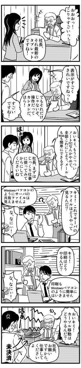 社長、ずいぶんスレートが気に入っている様子だ。ま、コンシューマ・スレートはWebブラウザとかメール・アプリケーションとかが標準で入っていて、簡単に使えるからな。おやおや、職場の若い女の子への自慢が始まっちゃったよ。