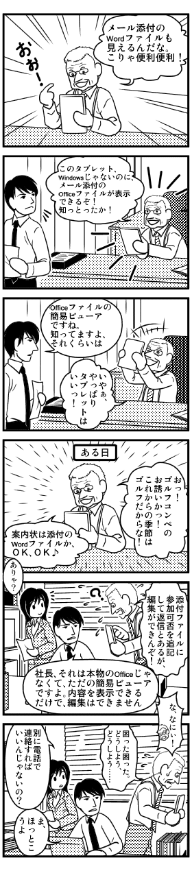 と思ったら、社長がまたおお喜びしているぞ。えっ、「メールに添付されて送られてきたWordファイルをちゃんと表示して読めた」って? ああ、それはOfficeファイルの簡易ビューアが標準でついているからでしょう。OSや機種にもよりますが、Word以外も、Excelとか、PowerPointのファイルなんかを開ける場合がありますよ。