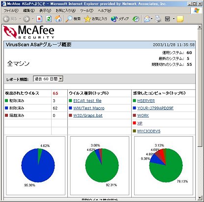 最後にもう1つ、忘れてはならない機能がある。データセンターが発行する「ウイルス対策レポート」だ。ウイルス検出や駆除情報から、各ローカルマシンの更新状況を一括管理し、レポートを作成。管理者はWebブラウザを通じ、社内の全ネットワークにおけるウイルス対策状況が一目で把握できる。そのほかにも個別のマシンのステータス情報として、定義ファイルバージョン、OSバージョン、Internet Explorerバージョンなども確認することができる。