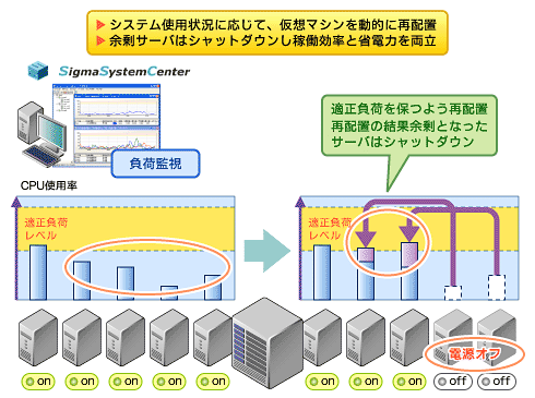 ブレードシステムSIGMABLADEでは、物理サーバ上に展開された仮想マシンの管理や運用をSSCが行う。SSCはCPUの負荷も監視しており、その情報を元に、システムの使用状況に応じてCPU負荷の低い物理サーバ上の仮想マシンを動的に再配置するという機能を持っている。つまり、少しの仕事しかしていないいくつかのサーバの処理をまとめて消費電力効率のよい適正負荷レベルに保つようにし、全体として稼働している物理サーバの台数を減らすのである。さらに新バージョンのSSC2.0では、再配置の結果余剰となった物理サーバの電源をシャットダウンして、消費電力をさらに削減できるようになった(図1)。もちろん、処理が増加してCPUの負荷が高くなれば、自動的に電源を再投入して処理を引き継ぐ。