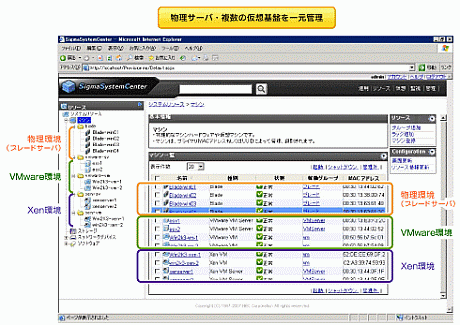 ひとつの筐体の中に複数のサーバを搭載するとともに、物理的なサーバ上に仮想環境を構築して一枚のブレード上に複数の仮想マシンを展開できるのが、ブレードサーバと仮想化を組み合わせることの大きなメリットだ。2008年1月に出荷開始となった運用管理ソフトウェアの新バージョン「SigmaSystemCenter(以下、SSC)2.0」では、この仮想化を利用した省電力運用の機能が強化されている。