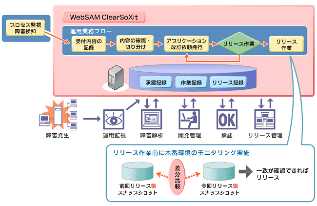 『WebSAM ClearSoXit』は、アプリケーション変更管理などのシステム変更手続き、承認、作業履歴を管理する(画像をクリックすると、拡大表示できます) |