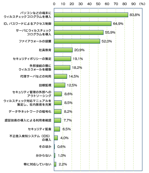 このような増大する脅威に対して、企業のセキュリティ対策はどこまで進んでいるのだろうか? 昨年7月発表の情報通信白書によると、クライアントPCへのウイルス対策ソフトの導入は83.8%と比較的高いが、サーバへのウイルス対策ソフト導入は55.9%、ファイアウォール設置は52.0%にしか過ぎない。