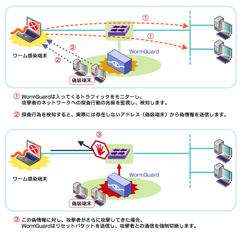 では未知のワームに対しての対応は不可能なのだろうか? その答えが、NECのWormGuard IPシリーズだ。WormGuard IPシリーズは、最新のセキュリティ技術※1を駆使し、ほかのセグメントや外部ネットワークへの2次感染を効果的に防御し、企業の情報資産を守る高信頼のセキュリティシステムだ。 感染力の強いワームは、効率よく感染を広げるためにポートスキャンに代表される事前探知を行う。WormGuard IPシリーズは、この事前探知をトリガーにして接続相手が不正なアクセスを目的としているかどうかを判断するのだ。 WormGuard IPシリーズは、ポートスキャンを検出すると、実際には存在しない仮想端末の応答パケットを返す。スキャン元が応答を受けて、一方的な接続を開始しようとすると、WormGuard IPシリーズは、その端末を攻撃者であると判断する。以降、その端末から別セグメントへの通信を、一定時間遮断するもので、シグネチャやパターンファイルのメンテナンスを行わなくとも、ワームによる脅威からネットワークを保護する。
