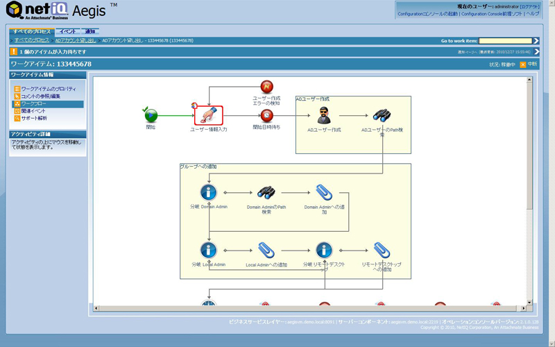 また、ワークフローの実行状況は、「Aegisオペレータコンソール」というコンソール画面から確認することができる。この画面からは、オペレータが実行中のワークフローの状態を細かく制御することもできる。