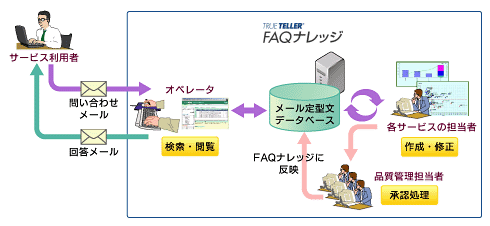 各種のカスタマイズを経て、FAQナレッジによる新メール定型文管理システムは、2005年8月に稼働開始した。FAQナレッジの特徴を生かし、新システムでは定型文の作成や承認などが明確にワークフロー管理されている。 まず、定型文の作成や修正は各サービスの担当者である正社員または委託社員のスーパーバイザー(SV)が行う。作成・修正された定型文は、各チームの品質管理担当者による承認処理を経て、FAQナレッジのデータベースに反映される。ユーザーからの問い合わせメールに対応するオペレータ(一般の委託社員)は、FAQナレッジの検索・閲覧のみ可能な権限を持つ(図参照)。