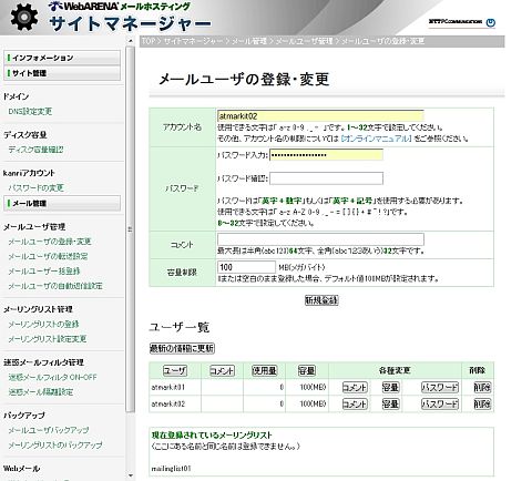 メールアカウントは、カンマ区切りテキストでアカウント名、初期パスワード、メールボックス容量、コメントをリスト化したものをアップロードして一括登録することも可能。迷惑メールフィルタを有効にした場合の迷惑メールの扱いは、スパムフラグを付ける、管理者が指定する任意の文字列([SPAM]など)を付ける、が選べる。さらにユーザー単位で、特定フォルダに隔離するか、通常メールと同様に配信するかの設定ができる。
