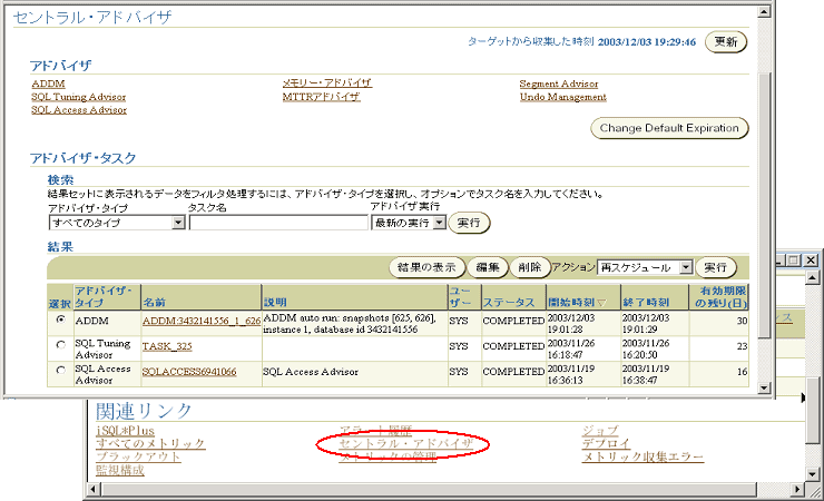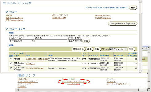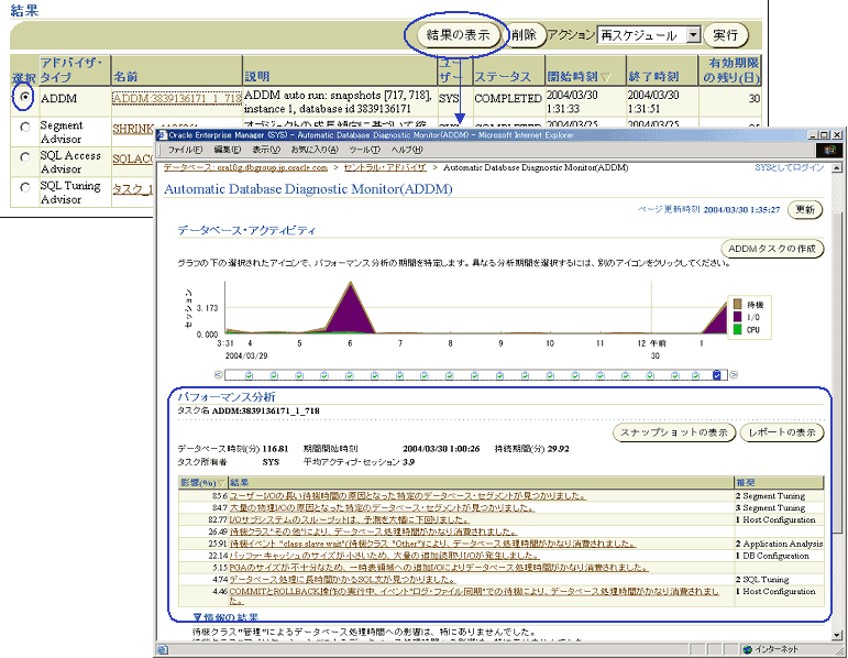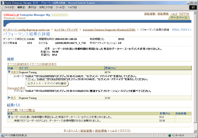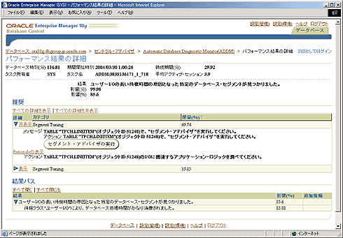 実践編では、導入・構築編でセットアップしたOracle RAC 10g環境を使って、実践的な演習に取り組むことで、Oracle RAC 10gのチューニング管理を身に付けることが目標である。Oracle RAC 10gのクラスタ・データベースとして優れている点は、GUIの管理ツールである「Oracle Enterprise Manager」の機能を活用することで、管理業務が大幅に軽減されることだ。特に、以前は手動で行っていたパフォーマンスチューニングにおける分析・診断を自動化する「Automatic Database Diagnostic Monitor(以下、ADDM)」およびOracle Database 10gで追加された各種アドバイザ機能をマスターすることは、実践編の重要なテーマの1つである。 ADDMとは、運用中のデータベースの状態をさまざまな側面から分析する機能だ。ADDMがパフォーマンスにおけるボトルネックを発見した場合、それがどういう原因で発生し、どのようにして改善できるかをADDM配下の各アドバイザと連携し、データベース管理者に提案することができる。従来、勘と経験に頼っていたチューニング作業がOracle Enterprise Managerの管理画面から簡単に実施できるようになった。