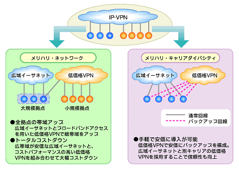 産業界全体でも通信業界ほどユーザーニーズが目まぐるしく変化し、日進月歩でサービスが進化している業界はないだろう。数年前にベストな選択肢だと思われたサービス形態がもう時代の要請に合わなくなっている。 この2、3年で新型WANサービスのIP-VPNは、専用線や従来型WANに比べてコストが低く、多拠点をフルメッシュ型で接続し、手軽にVPNが構築できる点が受け、急激に普及した。全社ネットワークをIP-VPNで統合した企業も数多く現れている。 ところが、どの企業もこの数年で通信トラフィックが増大。IP-VPNで構築したネットワークでは帯域が不足気味になっている。特に通信トラフィックが大きい大規模拠点で使う幹線でその傾向が目立つ。しかしIP-VPNの場合、広帯域メニューは料金が高くなりがちである。 そこで注目されるのが、信頼性が求められる本社やデータセンターなどの主要な拠点に広域イーサネット、小規模の事業所には経済性の高いVPNを導入するといった、環境により帯域とコストのかけ方にメリハリを付ける「メリハリ・ネットワーク」である。
