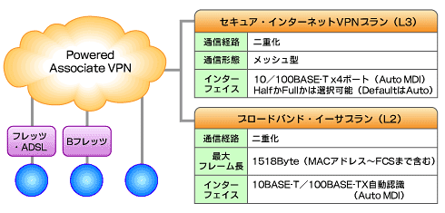 Powered Associate VPNの回線そのものは、NTTPCコミュニケーションズのVPN商品をOEM提供しているものだ。パワードコム 広域イーサネット商品企画部 広域イーサネット戦略グループの樋口太一氏がその理由をこう語る。 「われわれも数年前から、インターネットVPNは手掛けていたが、他社再販回線をもつことでキャリアダイバシティ・ソリューションを展開できる事と、フレッツアクセスをバンドルでき、冗長性、セキュリティなど付加価値も高いことから採用を決めた」 Powered Associate VPNには2つのプランがあり、「ブロードバンド・イーサプラン」は、レイヤ2サービスでIP以外のプロトコルも使える。通信経路が二重化されており、回線に障害が発生すると自動的にバックアップ経路へ切り替わる。もう1つの「セキュア・インターネットVPNプラン」はIP専門のレイヤ3サービスで、やはり通信経路を二重化。IPSecを利用したトンネリング技術により高いセキュリティ実現している。両プランとも、アクセス回線に安価なフレッツアクセスを利用できる。
