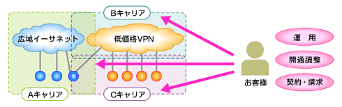 広域イーサネットは、IP-VPNと同等品質ながら広帯域メニューのコストが相対的に低い。一方、アクセス回線にNTT東西会社のフレッツ・ADSL、Bフレッツ(以後、フレッツアクセス)など個人向けブロードバンド回線を用いるVPNは、品質が若干劣るものの低料金が魅力だ。