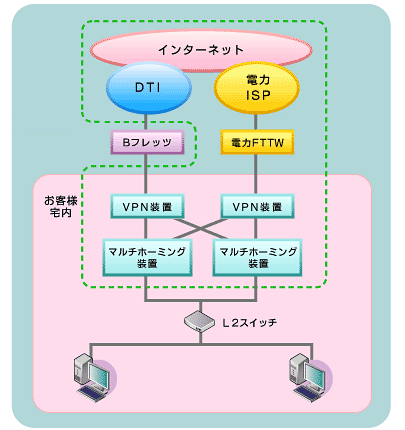 また、電力系FTTWで見逃せない魅力として、キャリアダイバシティ(通信事業者の二重化)を実現できる点が挙げられる。具体的には下図の通り、電力系FTTWとBフレッツ*2で冗長構成をとり、それぞれにVPN装置を絡ませたインターネットVPNサービスが提供される。