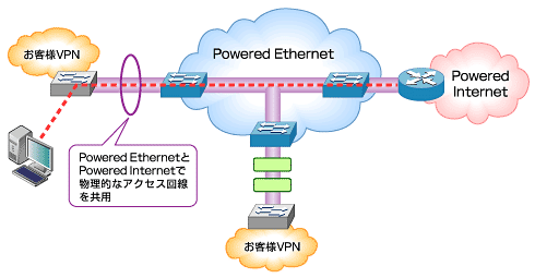 パワードコム独自の法人向けインターネット接続サービス、その第2の強化ポイントは、同社が強みを持つ広域イーサネットサービスPowered Ethernetとのサービス連携である。その具体策の1つとして想定されているのが、Powered Internet/Powered Ethernetでアクセス回線を共用化し、ユーザーのコスト負担や運用負荷を減らすこと。前述した通り、Powered Internetが広域イーサネットインターフェイスを採用しているからこそ実現できるのだ。