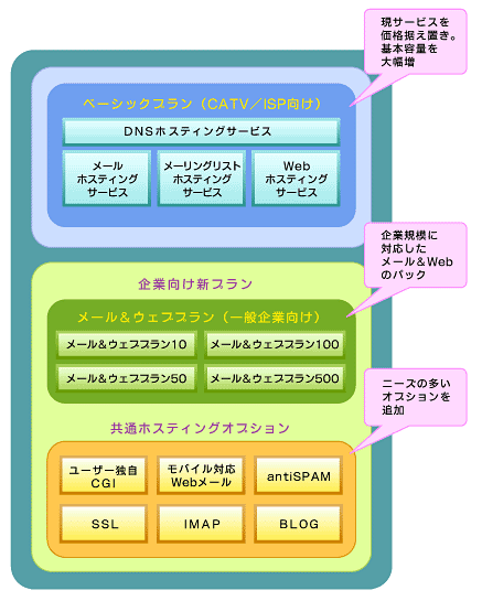 このメール&Webホスティングでは、事業者向け既存メニューのコスト・パフォーマンスを高め、一般企業向けの新プランを設けた。価格など詳しい内容はまだ明らかになっていないが、「競合他社に比べて数倍のコスト・パフォーマンスとなるようにサービス内容を設計している」(山本部長)と、かなり注目できそうだ。 これまで説明してきたPowered Internetを含め、この3回の連載で紹介してきた新企画、新サービスの詳細な内容については、パワードコムが5月24日、25日の両日、都内で開催する『POWEREDCOM