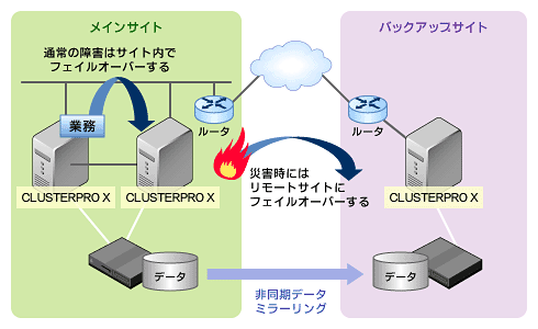 CLUSTERPRO Xシリーズが実現する“ハイブリッド型の遠隔クラスタリング”。通常の障害時にはメインサイト内でフェイルオーバーし、メインサイトに災害が発生した場合だけバックアップサイトにフェイルオーバーするので、コストやスピードを大幅に改善できる |