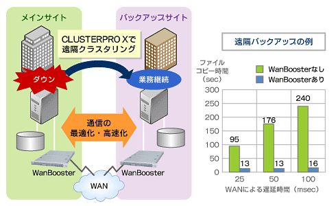 CLUSTERPRO XシリーズとWanBoosterを組み合わせた使用例。WanBoosterがネットワーク帯域を最適化するので、遠隔クラスタリングでも“ほぼリアルタイム”なミラーリングが可能となる。右側の表が遅延時間を表わしたもので、差は歴然だ |