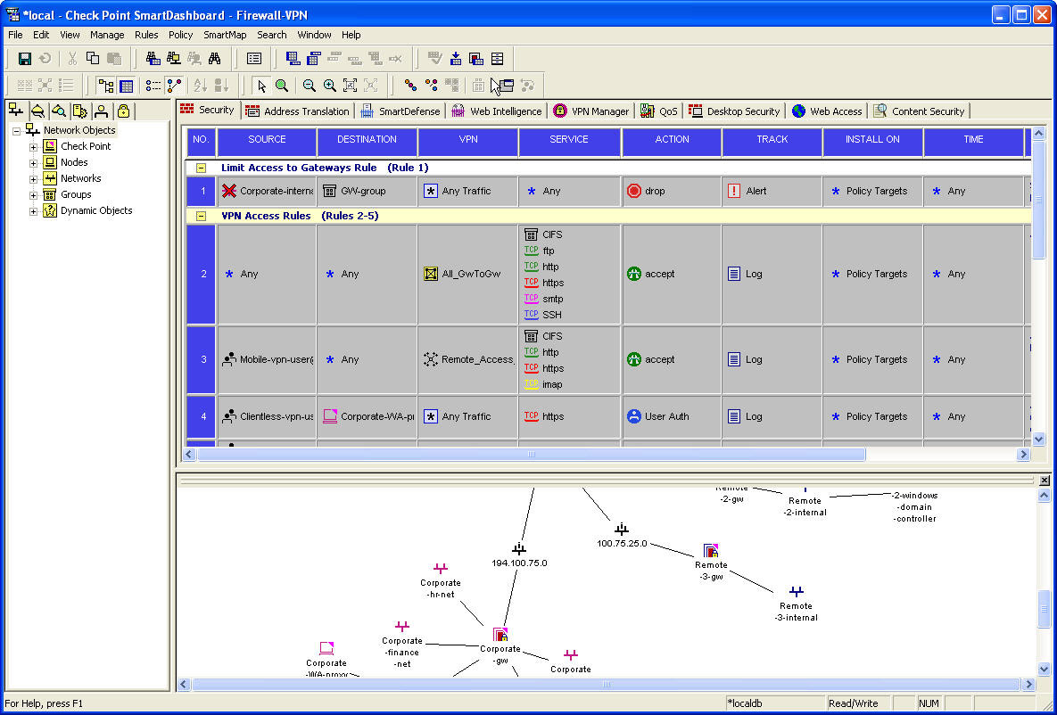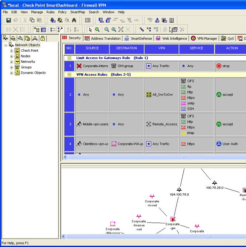 チェック・ポイントの管理画面はあらかじめネットワーク図を登録し、部署ごとにラベリングすることでその構成を直感的に把握できるようになっている。遠隔拠点のUTM-1であっても、センター側の管理サーバから設定が行えるため、一貫したセキュリティポリシーを中央から一斉配信することにより集中管理が可能だ。