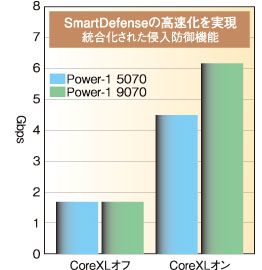 さらに注目すべきは、ハイエンドのPower-1に搭載された技術である「CoreXL」だ。これはマルチコアのCPUをフルに活用するための機能で、複数のコアにファイアウォールエンジンを分散し並列処理を行うことでパフォーマンスを向上させることができる。この機能をオンにすることで、侵入防御機能を利用した場合でも最大6.1Gbpsと、従来の3倍から4倍のスループットを確保することができる。