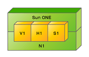 Sun ONEは、Webサービスの開発環境とソフトウェアプラットフォーム。そして、柔軟なコンピューティングリソースの提供を実現するビジョンがN1。N1のハードウェアプラットフォームは、V1、H1、S1の3つに大別できる |