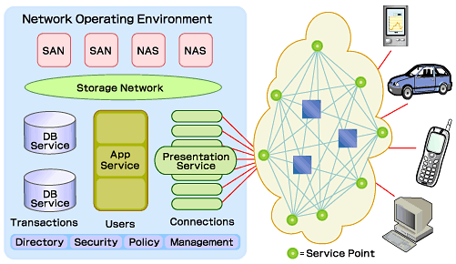 前回「SolarisTM オペレーティング環境」で紹介したように、現在のコンピューティング・パラダイムは、集中と分散の2極化が進行している。これは、Sun FireTM 15KのようなハイエンドサーバやPDA/携帯電話といった軽量端末など、個々のコンピュータ・ハードウェアについて言えることだが、システムというレベルでも同様の動きがある。 分散したデバイス同士が自由にコミュニケーションパスを確立し、通信を実行する。そして、爆発的に増加するコミュニケーションパスの途中で通信を中継し、付加価値を加えるという“サービス”を提供するサーバは、より大規模で信頼性の高いものにならざるを得ない、というのが前回紹介したサン・マイクロシステムズ(以下、サン)のビジョンであった。 そして、この大規模化する次世代サーバについてより詳細に見てみると、これはもはや単体ハードウェアとしての“サーバ”ではなくなりつつあるのが現状だ。サービスの提供主体、という意味ではまさにサーバと言えるのだが、現状のインターネット環境でのサービスの提供がどのような形で実現されているかを考えてみても、これが単体のハードウェアではなくなっていることが分かるだろう。 「n層アーキテクチャ」と呼ばれるシステムモデルは、いまやインターネット環境でのサービス提供システムの基本となっている、一般的には、クライアントからのコネクション要求を受け付けるWebサーバ群がフロントエンドとなり、中間層には具体的なサービスを実行するアプリケーションロジック層が置かれる。そして、バックエンドにはデータベースがある、という3階層モデルが基本となる。さらに、これら各階層のサーバ群がアクセスするデータストレージがSAN(Storage Area Network)やNAS(Network Attached Storage)という形で接続される。現在多くのWebサイトや各種のサービス提供者(xSP:Service Provider)が採用するシステムであり、インターネット上に散在する「次世代大規模サーバ」は、それぞれがこうした複雑な内部構造を持つ大規模なシステムとなっているのである。