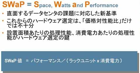 また、設置スペースの問題も大きい。消費電力の関係でラック当たりのサーバ搭載量を増やせない場合、ラックの本数自体が増加してしまうことになるが、データセンタをアウトソーシングしている企業の場合、当然ラックの数が増えれば、ラック単位で決められているコストも上がる。 こうした問題を見ていくと、TCO削減の新しいテーマが「消費電力」と「設置スペース」であるという指摘を、理解されるに違いない。 こうしたなか、サン・マイクロシステムズでは、SWaPという興味深い新評価基準を打ち出している。SWaPとは「Space Watt and Performance」の略で、単位当たりの消費電力のことだ。