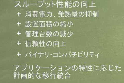 また、小型サーバの導入では、初期導入コストは抑えられても運用コストが抑えられるとはかぎらない、という現実を直視したい。その意味で、TCO削減という視点からシステムの移行統合を検討することも、選択肢の1つとなるだろう。統合によって、トータルの消費電力や発熱量、設置スペースが減り、運用コストが低減され、同時にシステムの拡張性を保証できる環境が整えば、願ったり叶ったりではないだろうか。 アプリケーションのタイプに応じた統合も意味を持つだろう。膨大な量の演算を行ったり、大規模データベースから条件に合致したデータだけを検索したり、あるいはWebフロントでスループットの高いアクセスを行ったりという具合に、アプリケーション特性はさまざまである。 従って、今後は、TCO削減というテーマのもと、アプリケーションのタイプに応じた「適材適所の性能を有するサーバ環境の最適化」が求められているといえる。「いま、システムが動いているから大丈夫」という考え方では、ライバル企業の後塵を拝することにならないだろうか。