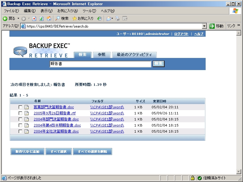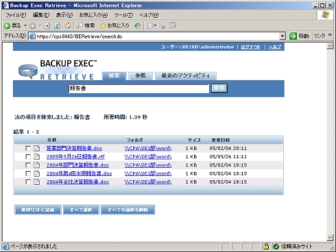 スナップショットは64世代まで保存可能な上、最短で1時間ごとに取得できる。定期的に、データのポイント・インタイムのスナップショットを取ることで、それぞれの時点におけるファイルの状態が、バックアップサーバ上に瞬時に保存されるのだ。そして、世代管理されたファイルはWebインターフェイスのリトリーブ画面で容易に検索できる。これにより、IT管理者だけでなくエンドユーザーがWebベースの検索エンジンを使う感覚で、リカバリしたいファイルを自由に検索・ダウンロードすることが可能だ(画面1)。