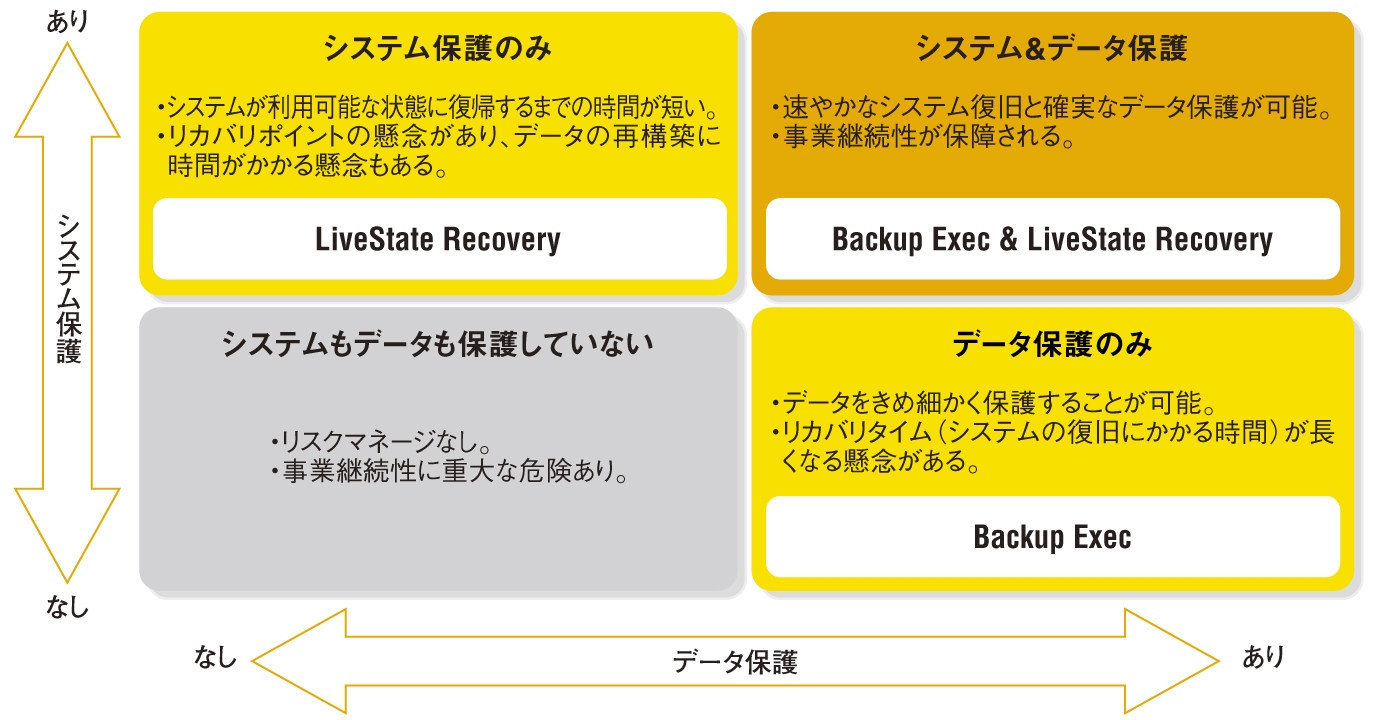 例えば、RPOを短縮し、データの損失を少なくしても、肝心のシステムが復旧していなければ、業務を再開することはできない。逆にRTOを短縮しシステムは復旧できても、バックアップしたデータが最新のものでなければ、スムーズな業務の再開も困難だ。その意味で、データ保護とシステム保護は、事業継続性を確保するための車の両輪だといえるだろう。 しかし、データとシステムでは、その特性の違いから更新ポイント、つまりバックアップを行うタイミングも異なってくる。データは継続的にその内容が変化するため、最新のデータを保護するにはリアルタイムのバックアップが必要だ。一方、システムは新しいサービスパックや新規アプリケーションの追加、パッチの適用時などが更新ポイントとなる。 この2つの要件を満たすには、データ保護およびシステム保護に最適化されたソリューションを組み合わせて活用するのが有効だ。それを可能にするのが、シマンテックのデータ保護ソリューション「Symantec Backup Exec 10d」とシステム保護ソリューション「Symantec LiveState Recovery 6.0」である。