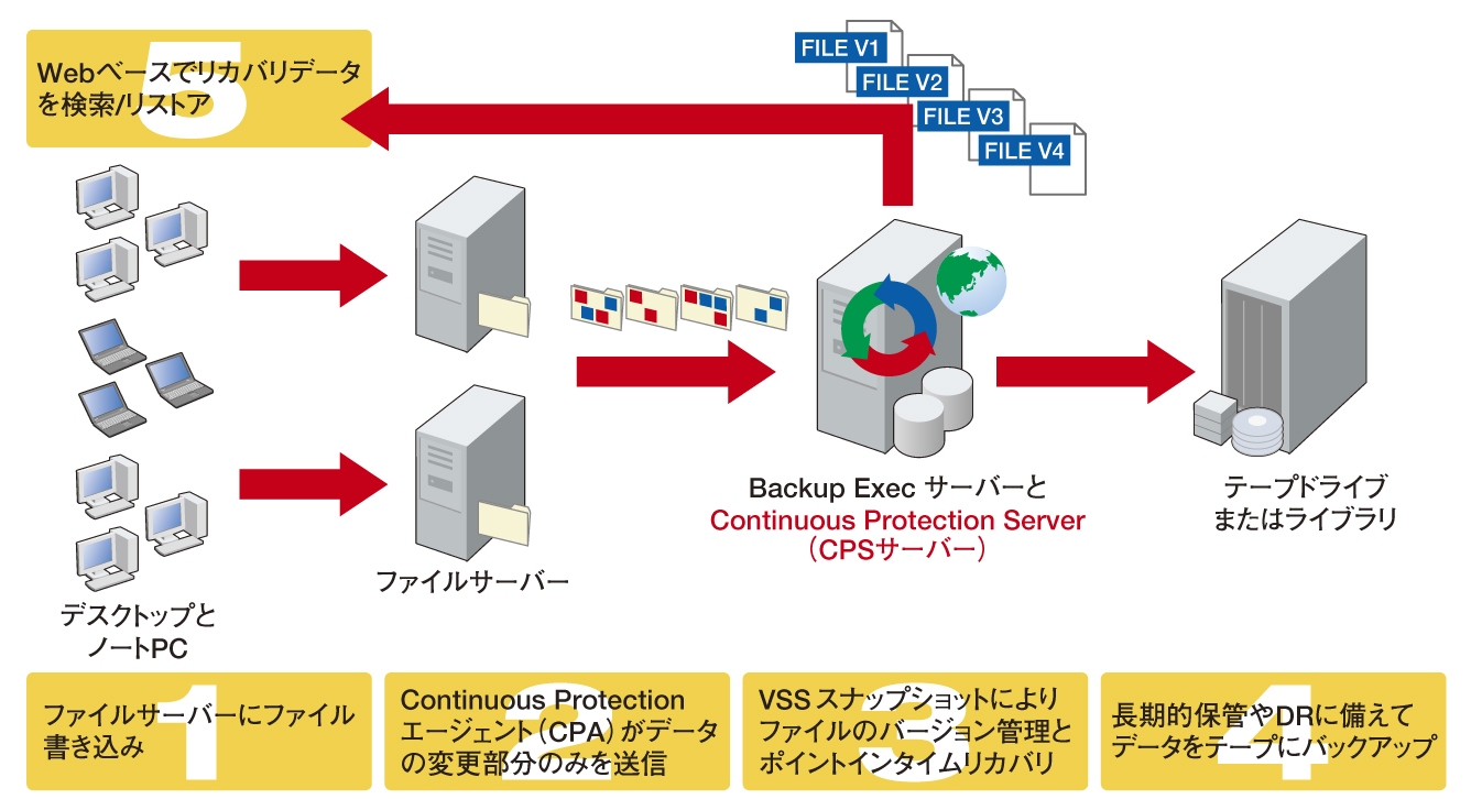 現在、ほとんどの企業では、リカバリしたいファイルをシステム管理者に通知し、システム管理者がその要求をもとに該当するバックアップ用のテープを検索。その上で、該当ファイルを探し、リストアするといった手順をとっている。しかし、CPSのディスクバックアップを活用すれば、リアルタイムなデータバックアップ、シームレスな運用が実現するだけでなく、それにかかる時間や人員、そして運用負荷を大幅に軽減することができるのだ。 さらに、こうしたCPSの機能はリモートオフィス(支社、支店)の統合バックアップにも有効だ。遠隔地にあるリモートオフィスのデータをCPSを使って、本社側で一元的にバックアップ可能。リモートオフィスに管理者を配置せずに、効率的なリモートオフィス・バックアップが容易に実現可能となる。