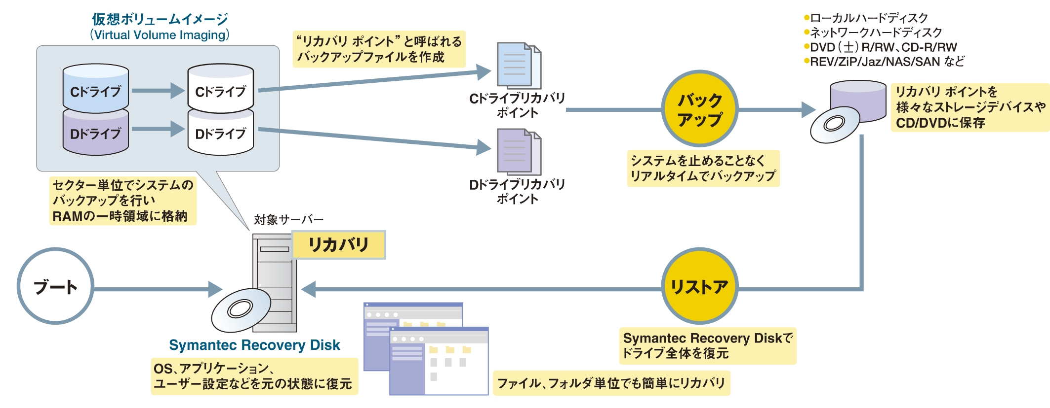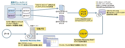 Virtual Volume Imagingテクノロジーとは、スナップショットによりディスク全体の仮想ボリュームイメージを作成する技術のこと。スナップショットは、システムが稼働中でも取得できる上、それに基づいた仮想ボリュームイメージは、ディスクの構造全体をセクタまたはクラスタ単位で作成される。ディスク構造全体をバックアップしているので、OSやアプリケーションの区別なくシステム全体を保護することができるのだ。 なお、リカバリポイントではDVD、CD-R/RWなどのディスクメディアのほか、ファイルサーバ、NAS、SANなどにも増分バックアップが可能だ。 また、リカバリ作業の簡素化も実現。例えば、ハードウェア障害が発生した場合、通常、ハードウェアの準備を行い、OSの再インストール後、再起動、そしてサービスパック適応、アプリケーションの再インストールという煩雑な作業が必要だった。 しかし、LSR6.0ではインストール用のCDでもある「Symantec Recovery Disk(以下、SRD)」を起動することで、リカバリポイントを簡単にリストアできる。SRDは、Windows PEをベースに作られており、主要メーカーのデバイスドライバが組み込まれている。SRDを起動し、リカバリポイントをリストアするだけで、OS、アプリケーション、ユーザー設定などを元のシステム状態に復元。簡単かつ短時間でシステムを復旧することが可能なのだ。