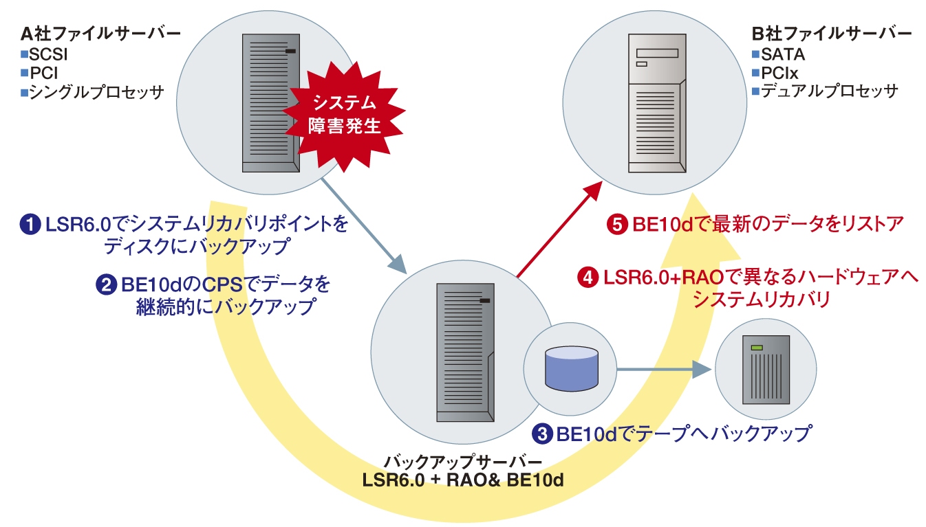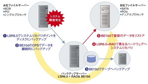 冒頭に触れたように、事業継続性を確保するにはデータ保護およびシステム保護の両面からバックアップ/リカバリを考える必要がある。それには、ここで紹介したBE10dとLSR6.0を併用することが有効であり、事業継続性の確保に取り組む企業が選択する上で最適解ともいえる選択肢となる。 例えば、システム保護にはシステム情報が更新された場合を更新ポイントとして、LSR6.0でリカバリポイントを作成。データ保護にはBE10dを使い、リアルタイムなバックアップを行う。さらに、LSR6.0のRAOをインストールしておけば、万が一リカバリポイントを作成した機種に障害が発生し場合でも、異なる機種へシステムリカバリできるのだ。そしてBE10dで、ほぼリアルタイムの最新データを復元する(図4)。