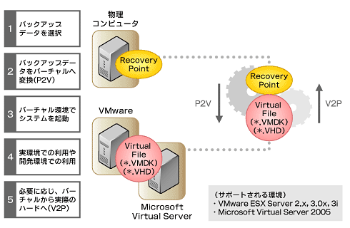 BESR8のリカバリポイントを仮想サーバへ展開することも可能。またその逆に仮想サーバで作成したリカバリポイントを物理マシンに戻すこともできる |