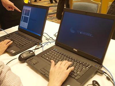 今回、SEP11.0 MR3とSCS 3.1の快適性比較実験に臨んだのは、Security & Trustフォーラムの担当編集者である宮田、セキュリティ関係を中心に長年ニュースを書いてきた高橋、そして副編集長の岡田の3人。2008年11月21日に開催されたシマンテックのイベント「Symantec Vision 2008」の会場の一角で実験は行われた。
