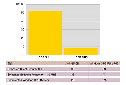 起動時間の長さのテストでは、電源をオンにしてからログイン画面を経て、System Idle Processが95%以上を示した状態が10秒以上続いた時点までを計測している。セキュリティ対策製品を導入していない“素”のWindows XP SP3の起動時間が29秒であるのに対して、SCS 3.1は82秒を記録しており、その差は53秒だ。一方、SEP 11.0 MR3では36秒まで改善されており、“素”のWindowsの起動に対して7秒遅れとなった。