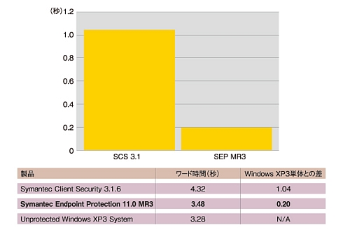 Microsoft Word 2007で188KBの文書を開くテストでは、セキュリティスキャンをせずに開いた場合、3.28秒となる。これに対して、SCS 3.1ではスキャンを行うため1.04秒の時間が必要となり、文書を読み書きできるようになるまで4.32秒の待ち時間が発生していた。ところが、SEP 11.0 MR3では、その差は0.20秒とほとんど無視できるところまで短縮している。