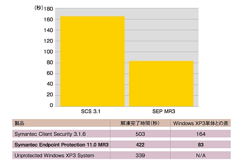 参考までに、シマンテックによる検証データも見てみよう。これは、同社のテスト環境において得られたデータである。比較の対象は、SCS 3.1とSEP 11.0 MR3となっている。なお、使用されたPCは、CPUが3.4GHzのデュアルコア、物理メモリ1GB。Windows XPにSP3と2008年10月21日時点でのすべてのアップデートを適用している。