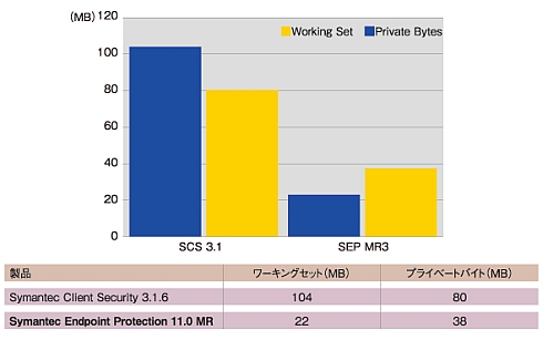 最後に、アイドル時におけるシステムメモリの使用バイト数の計測データを見てみよう。ワーキングセットでは、SCS 3.1の104MBに対して、SEP 11.0 MR3は22MBになっているように、使用していないメモリを積極的に解放している様子が分かる。
