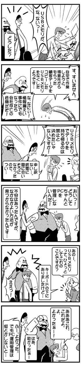 いやぁ、まいった。得意先から預かった顧客データを持ち出すなんて、完全なルール違反だよ。社内の情報管理ルールをあれほど厳しく決めたのに、まったく無視されてしまった。