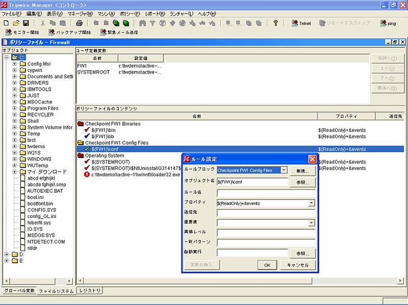 レポーティング機能面でも、商用版はオープンソース版よりも優れている。オープンソース版では、テキストファイルによるレポートの書き出しとメールでの送信にしか対応していないが、商用版ではテキストに加えてHTML、XMLでも書き出しが可能だ。レポートは、メール、システムログまたはSNMPトラップを介して送信される。HTMLで出力されたレポートは当然Webブラウザで閲覧できる。 また、Tripwire Managerと連携すると、色分けしたアイコンによって変更の重要度をビジュアル的・直感的に把握できたり、グラフを使った要約を作成できたりする。社内向けの報告レポートの作成に費やす時間を減らせることからも、管理者の負担減に貢献する機能だろう。 管理者の負担という視点から商用版がもっとも評価できるのは、ポリシーファイルの作成が圧倒的に楽になったということだろう。オープンソース版では、テンプレートが用意されているもののテキストファイルをカスタマイズしてポリシーを作成する必要があった。これは、正直なところ骨の折れる作業なのだが、「最初に1回だけポリシーを書けば、あとはなんとかなるからがんばろう」と自分を納得させる管理者は多かったのではないだろうか? 商用版にも、各OSにあわせたデフォルトポリシーファイルが最初から用意されている。さらにTripwire Managerを使えば、GUIを使ってポリシーを編集することができる。必要に応じて監視対象のファイルやディレクトリのチェックオプションを設定し、柔軟なサーバ運用ができる。また、実際にサーバを運用してみて初めて分かる意図しない「ポリシー違反」をチューニングする場合にも、ポリシーファイルの必要な部分だけを更新することが可能だ。 さらに、ワイルドカードを使うこともできる。例えば、「*.dll」と記述することで、特定のフォルダやディレクトリにあるすべてのdllファイルを監視の対象にすることが可能だ。ワイルドカードは包含検索と除外検索の両方に対応しているので、監視対象からすべて外すという使い方もできる。