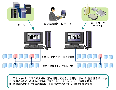 Tripwireの基本的な動作は、サーバが安定している状態(つまり管理者が意図している状態)をベースラインスナップショットとして記録しておく。このベースラインとサーバの稼動状況を比較することで、変更・改ざんを検知する。これを整合性チェックと呼ぶ。なお、ベースラインは1024ビットの暗号アルゴリズムで署名されており、ベースラインそのものが改ざんされることを防いでいる。 例えば、公開Webサーバ上のデータが悪意のある者によって書き換えられたとする。Tripwireを使うことで管理者はどのファイルが改ざんされたかをすばやく把握できるだけでなく、元の状態へと復旧させることも可能だ。また、管理者が意図する変更、つまりパッチファイルの適用やソフトウェアのアップデートなどについても、「管理者の意図通りの変更がきちんとなされたかどうか」を確認できる。