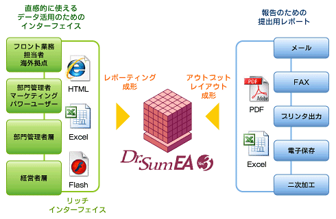 そのように、従来のBIシステムには日本のビジネスニーズにうまく適応できていない点が多々あったのだが、それを解決すべく誕生したのが、ウイングアーク テクノロジーズのデータ活用・情報活用ツール「Dr.Sum EA」である。
