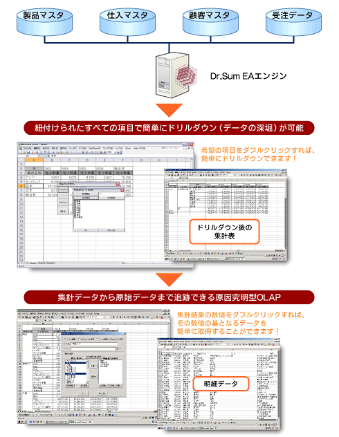 また、詳細データを有しているため、エンドユーザーが紐付けされているすべての項目で簡単にデータの深堀(ドリルダウン)ができ、元データまで抽出(ドリルスルー)することも可能である。Dr.Sum EAが別名“原因追究型データ活用ツール”と呼ばれるのも、この機能によるものだ。