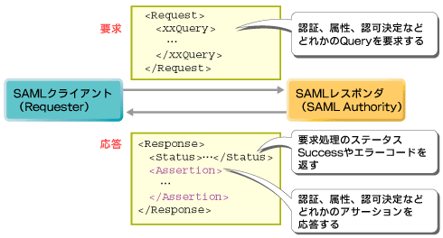 SAMLプロトコルを図7に示す。SAMLクライアント(Requester)は要求プロトコル<Request>要素の子要素に各種の<Query>要素を指定して要求を送信する。SAMLレスポンダ(SAMLオーソリティ)は応答プロトコル<Response>要素の子要素に<Status>要素と<Assertion>要素を含めた応答を返す。<Response>処理で何らかのエラーが生じた場合、<Response>要素は<Status>要素にエラーコードを返すだけで<Assertion>要素は含まない。