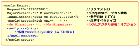 SAML<Request>のQuery要素は要求の種類(認証、属性、認可など)に応じて以下に示すような各種のQuery要素のどれか1つを指定することになる。