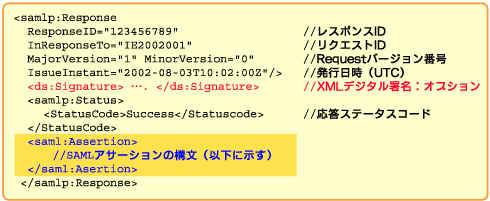 応答プロトコルに含まれる<saml:Assertion>には認証、属性、認可決定の<Query>に対応する<Assertion>には、以下のような子要素が含まれる。