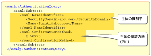 図10に示す認証問い合わせは、X.509v3の証明書を使って認証アサーションを要求する例である。この認証要求に対して図11の認証アサーションが返される。