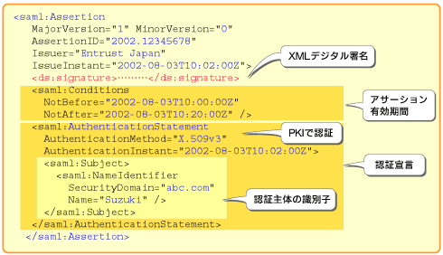 SAMLアサーション(SA)はある主体についての認証や属性、認可権限についての問い合わせに対してSAMLオーソリティがそれぞれの内容を証明するステートメントである。PKIの公開鍵証明書(PKC)もCA(Certification Authority)が主体の本人性(Identity)と公開鍵の結合を証明するアサーションといえる。しかし、SAMLアサーションとPKCはいくつかの異なる側面を持っている。認証アサーションは主体の本人性だけを証明するのに対して、PKCは本人性と公開鍵の結合を証明する。